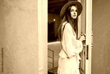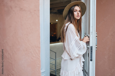 Young beautiful woman in white dress and hat thoughtfully looking in camera while opening white door of cafe