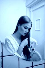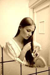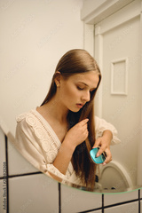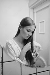 Young beautiful pensive woman in white dress standing near mirror dreamily brushing her hair in bathroom alone