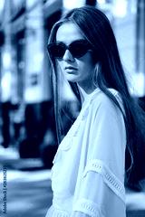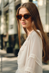 Young beautiful woman in sunglasses and white dress thoughtfully looking in camera while standing on cozy city street alone
