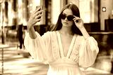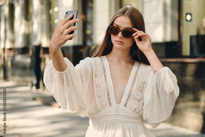 Young attractive woman in sunglasses and beautiful white dress thoughtfully looking aside while taking photo on cellphone on cozy city street
