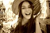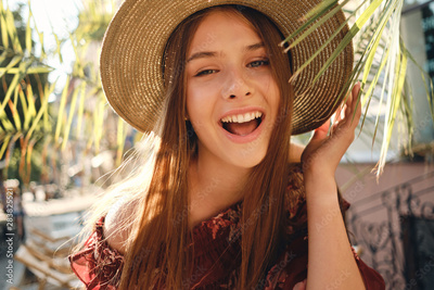 Close up young pretty cheerful woman in dress and straw hat happily looking in camera with big green leaves on background in street cafe