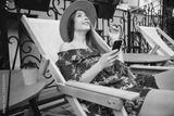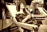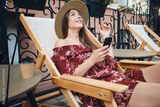 Young pretty smiling woman in dress and straw hat holding cellphone in hand happily looking up while sitting on deck chair with cup of coffee to go in cozy street cafe
