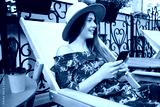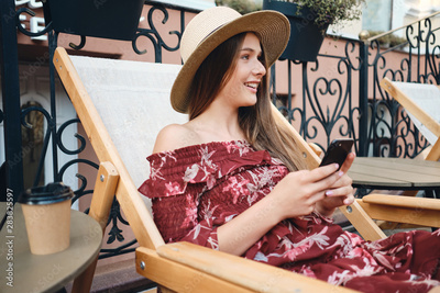 Young attractive smiling woman in dress and straw hat holding cellphone in hand joyfully looking aside while sitting on deck chair with cup of coffee to go near in cozy street cafe