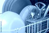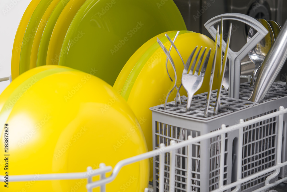 close-up of clean metal cutlery and plates, in the dishwasher, after work