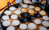 Mortar-toasted pastry or "Kanom Krok" is Thai traditional dessert. Woman hand removing Kanom Krok from stove by spoon. Street food in Thailand. Thai dessert made from coconut milk and flour.