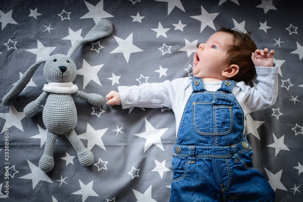 The baby is sleeping with a toy. a small child sleeps by the window, dreaming of a starry sky before going to bed. sleep concept. Top view, flat lay