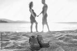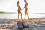 pregnant couple on the beach at sunset. pregnant girl posing with her husband against the background of a beautiful sunset during the blue hour. waiting for the baby.