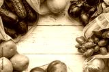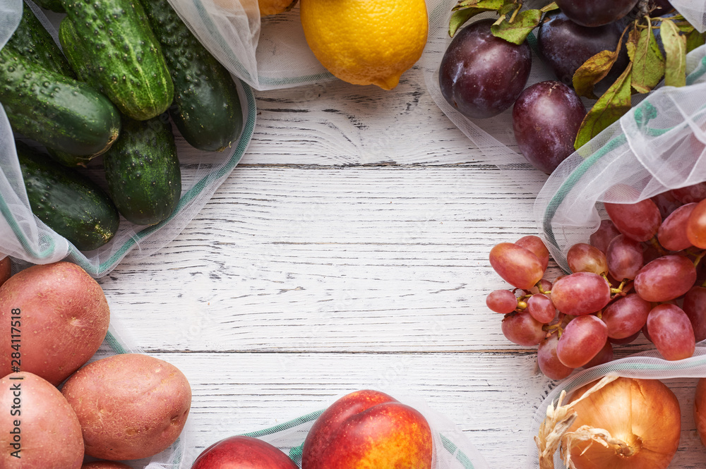 Frame of fruits and vegetables in reusable eco bags at white wooden background. Recycled bags instead of plastic bags. Plastic free. Top view flat lay with copy space