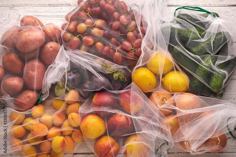 fruits and vegetables in reusable eco bags at white wooden background. Recycled bags instead of plastic bags. Plastic free. Top view flat lay