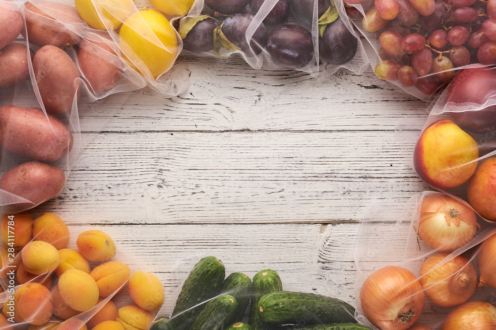 Frame of fruits and vegetables in reusable eco bags at white wooden background. Recycled bags instead of plastic bags. Plastic free. Top view flat lay with copy space