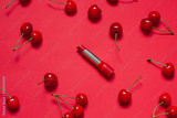 Red lipstick on the red background with ripe cherries. Top view. Beauty close up