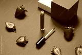Red lip gloss beauty concept close up with fresh strawberries on the red background.