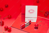 Red lipstick on the red background with ripe cherries and a lip kiss on the paper. Valentines day concept card
