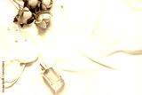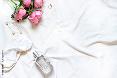 Concept lifestyle flat lay on the white blanket with peony flowers. Copy space