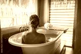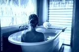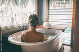 Luxury bath woman wellness spa relaxing soaking in warm water bathtub of hotel suite.