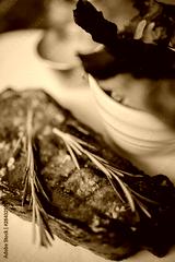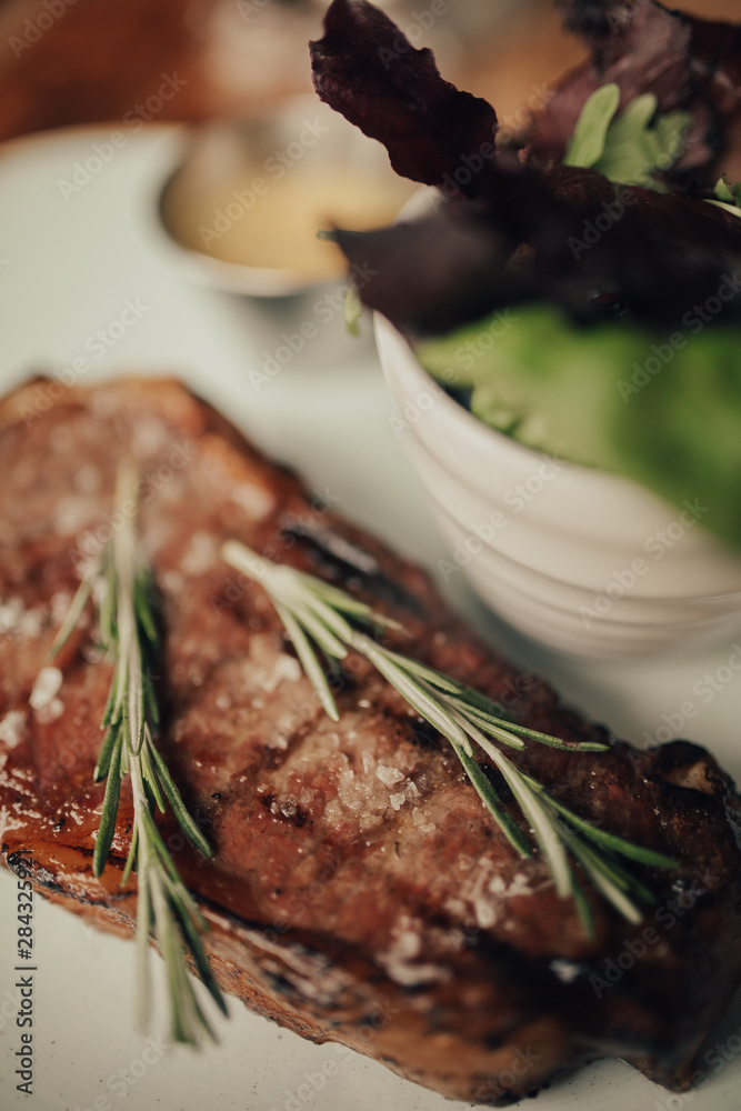 A close up shot of a beef rib eye steak with sea salt and rosemary served on a ceramic plate with salad and sauce. Concept of restaurant, food and culinary.