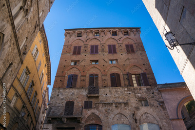Medieval building of red brick on Piazza del Campo in Siena, Italy