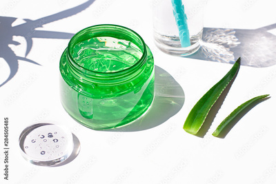Aloe vera fresh gel in a plastic bottle close up on the white background. After sun cooling skin cosmetics
