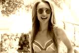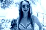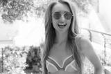 Close Up Happy Woman Face Summer Holidays. Summertime Smile Girl with Blond Hair at summer vacation in swim suit. Selective focus. Pink sunglasses