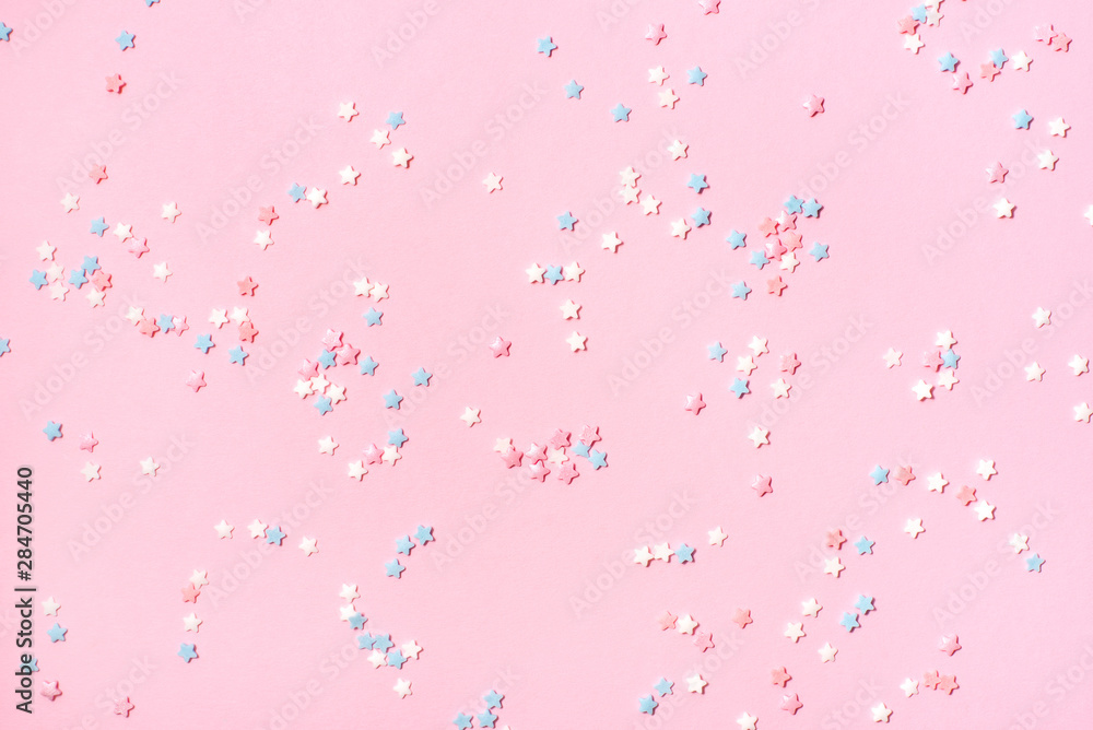 Confetti in the form of small stars on a pink background. Holiday concept.