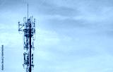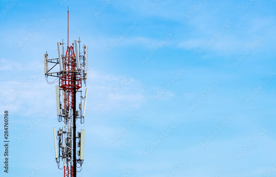Telecommunication tower with blue sky and white clouds background. Antenna on blue sky. Radio and satellite pole. Communication technology. Telecommunication industry. Mobile or telecom 4g network.