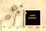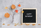 Happy Saturday text on black letter board and bouquet of branches with yellow leaves on clothespins in vase on table Template for postcard, greeting card Concept Hello autumn Saturday