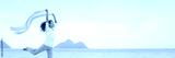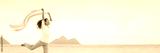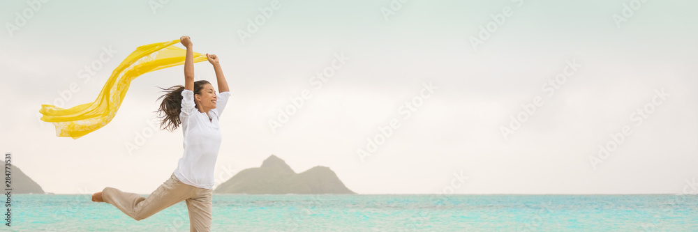 Happy woman jumping of happiness with scarf in wind feeling freedom emotion banner panorama background. Asian girl leap of faith.
