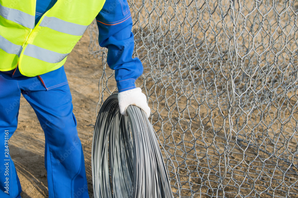 against the background of the grid, the hand of a builder in a white glove, takes a coil of wire, close-up