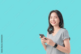 Young smiling Asian woman holding smartphone and wear smartwatch isolated on light blue background.