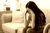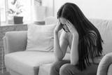Asian woman are holding their hands to the head in pain on the sofa at home, Young women have severe headaches from migraines, Health and illness concept