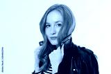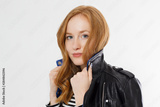 Woman beauty power. Close up of red haired girl face and leather jacket isolated on white background. Skin care, blue eyes and beautiful face. Copy space and selective focus. Redhead and no make up.