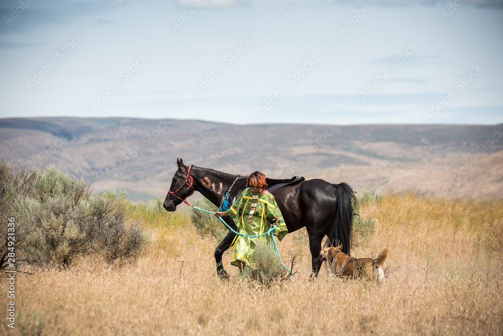 Native American Indian Girl walking with her horse