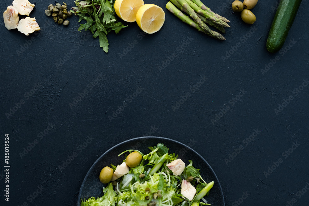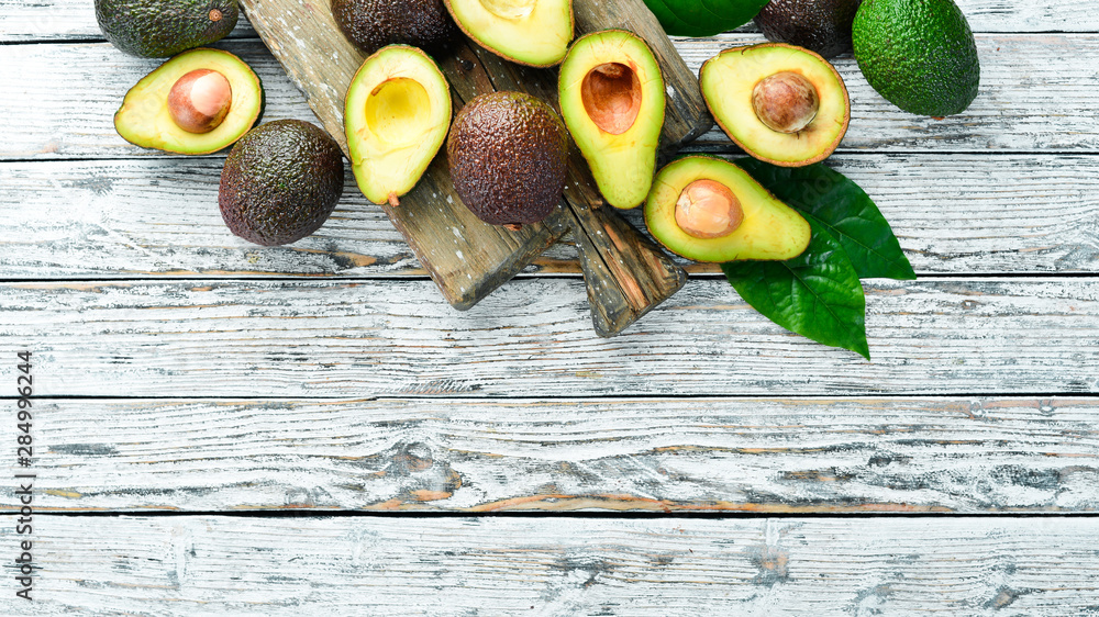 Avocado and green leaves on a white wooden background. Rustic style. Top view. Free space for your text.