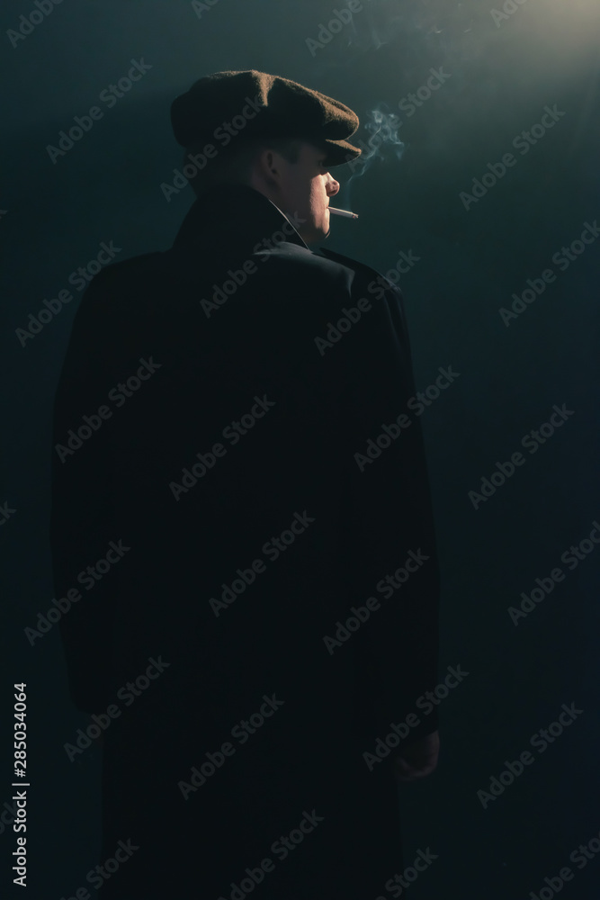 Retro man with cap smokes cigarette in smoky room. Side view.