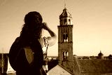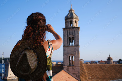 young woman takes photo at the city walls of Old town Dubrovnik, Croatia - Travel concept