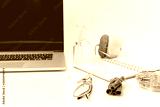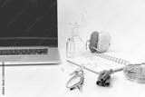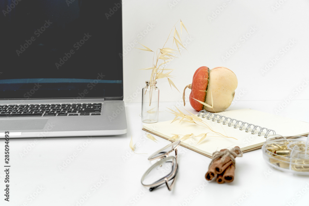 Autumn workspace still life. Notebook and daily planner mock-up scene with elegant stationary, glasses, herbal, cinamon and pumpkin. Fall feminine styled composition. White table background.