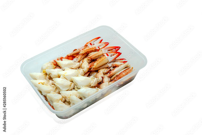 Steamed crab meat pack in plastic box for delivery. Seafood ready to eat delivery business. Steamed lump crab meat in disposable plastic container. Seafood industry. Thai style seafood. Crab leg meat.