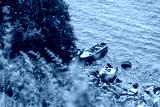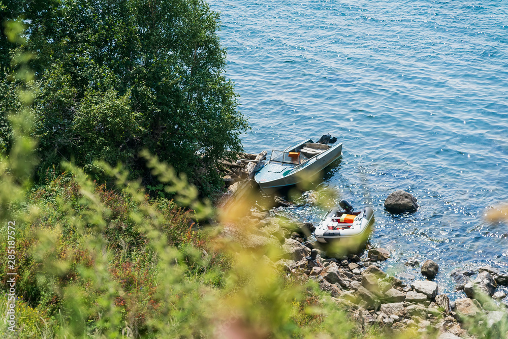 Summer picturesque sunny day, boats on the lake, view from the hill through wild green grass. Natural background
