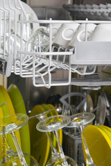 background of the details of the dishwasher with plates of different colors, yellow, green and the legs of glasses for wine