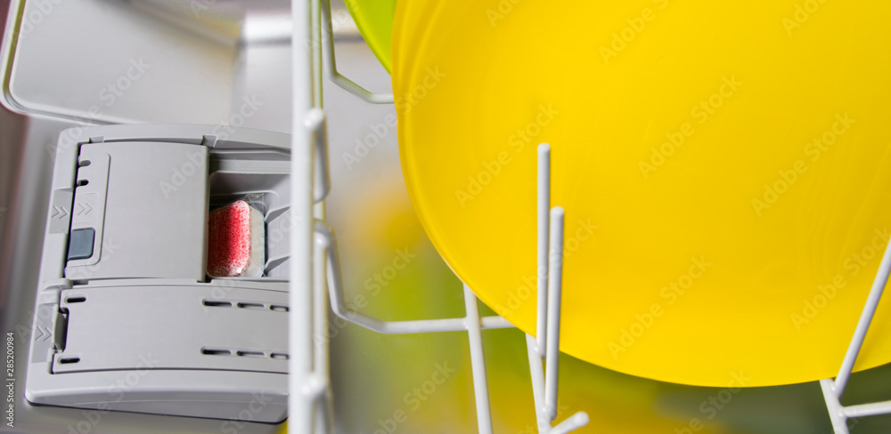 close-up, container and capsules for cleaning and a plate on the loading net, in the dishwasher