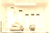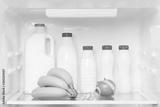 on the shelf of a white fridge, green apple, bananas, body measurement tape and dairy products, kefir, cream, yogurt