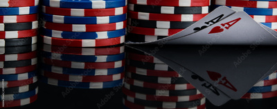 close-up, a set of pyramids of poker chips and two highest cards, on a black background with reflection