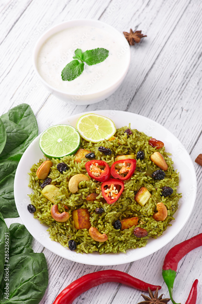 Palak Paneer Biryani and Raita at white wooden background with decor. Palak Paneer Biryani is vegetarian indian cuisine dish with spinach, paneer , basmati rice, spices, nuts and raisins. Vertical