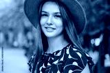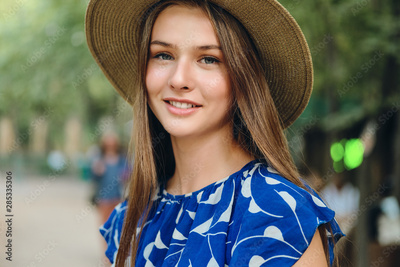 Portrait of pretty smiling girl in blue dress and hat dreamily looking in camera in park