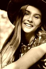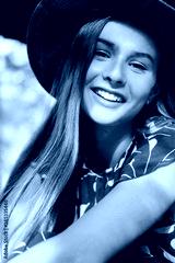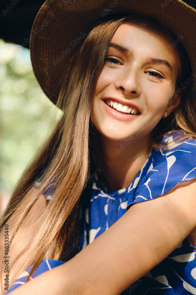 Portrait of pretty smiling girl in blue dress and hat happily looking in camera while sitting in city park