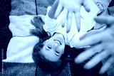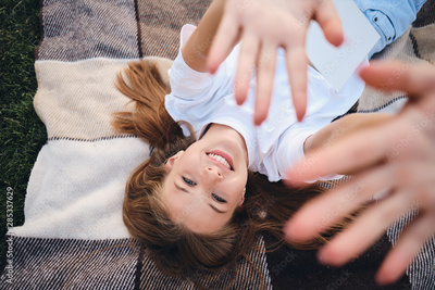 Beautiful smiling teenage girl lying on plaid while happily pulling hands up to camera on picnic in park