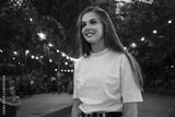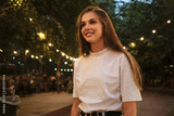 Young pretty smiling woman in white T-shirt happily standing in park at night