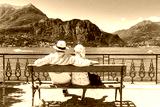 Lake Como, village Bellagio, Italy. Senior couple weekend getaway having rest on the bench by spectacular lake Como in Italy. Sunny day scenery. Tourists admiring view on popular tourist attraction.