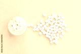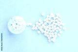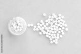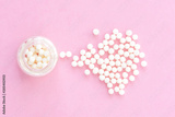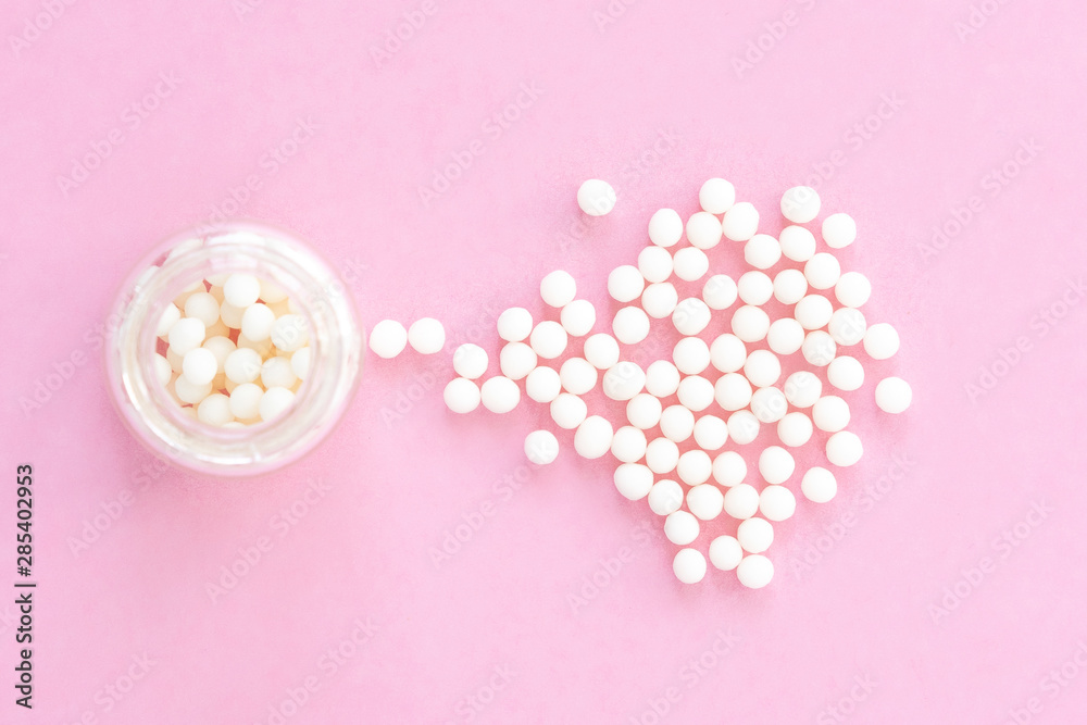 Homeopathy eco medicine concept - classical homeopathy pills in vintage glass bottles on pink background. Flatlay. Top view. Copyspace