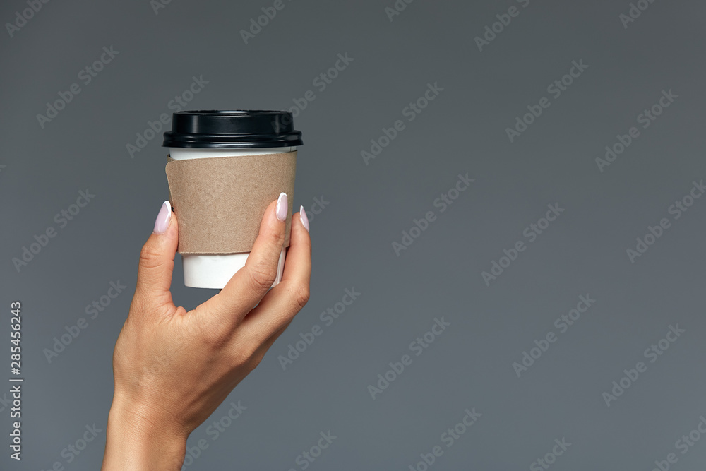 A beautiful female hand offers a hot drink, tea or coffee in a disposable natural glass on a light gray background. CONCEPT start of the day with a cup of coffee